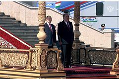Встреча двух лидеров проходит в Душанбе. К Дворцу Нации российский президент приехал на лимузине Aurus.