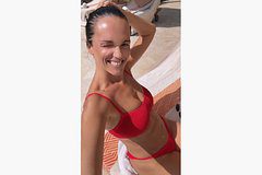 45-летняя исполнительница снялась в красном раздельном купальнике в рубчик. Данный комплект состоял из топа на бретелях и плавок с низкой посадкой.