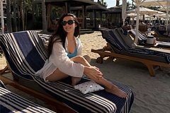 29-летняя блогерша предстала на размещенных кадрах, сидя в шезлонге на пляже. Она позировала в голубом слитном купальнике и полупрозрачной белой рубашке.