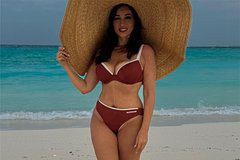 Телезвезда предстала на размещенном кадре в бикини бордового цвета, состоящем из подчеркивающего грудь бюстгальтера и плавок с низкой посадкой. При этом она позировала на камеру в соломенной шляпе с широкими полями, распущенными волосами и ярким макияжем.