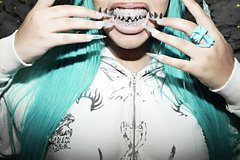12-летняя наследница знаменитостей с окрашенными в синий цвет волосами продемонстрировала зубные накладки, покрытые драгоценными камнями. Данные протезы бренда Johnny Dang & Co. имели заостренную форму.